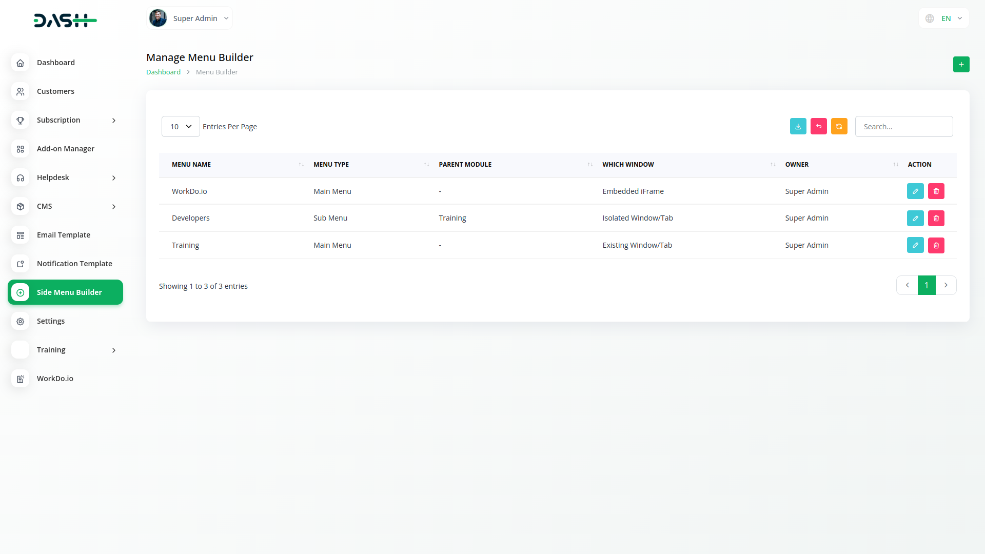 You can create a side menu by simply clicking the Create button. In which you can manage the menu and also edit that menu according to your own. And you can delete that menu. The sidebar can be created from both the company side and the super admin side. Additionally, menus created and enabled from the Super Admin side are visible across all companies.