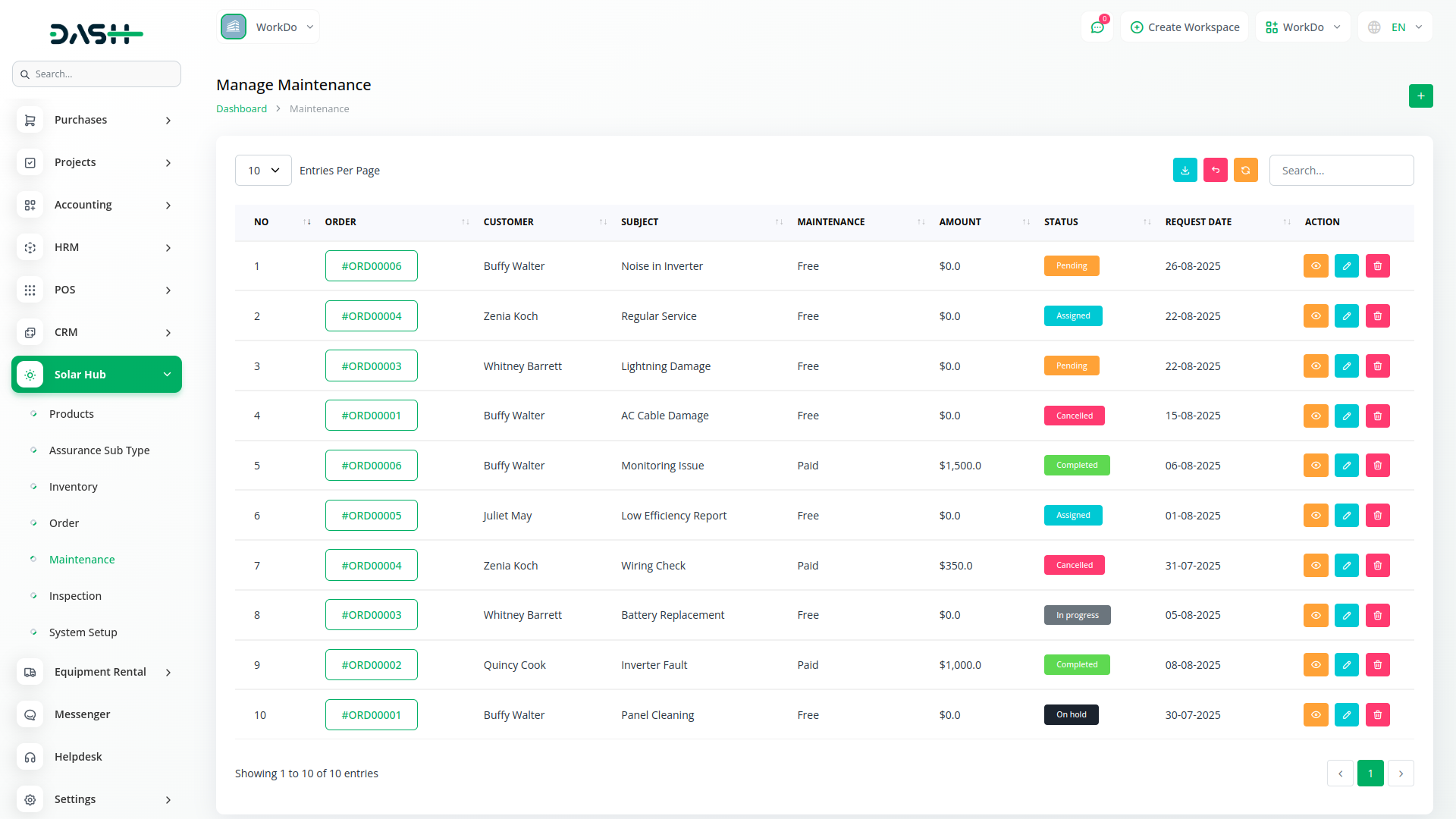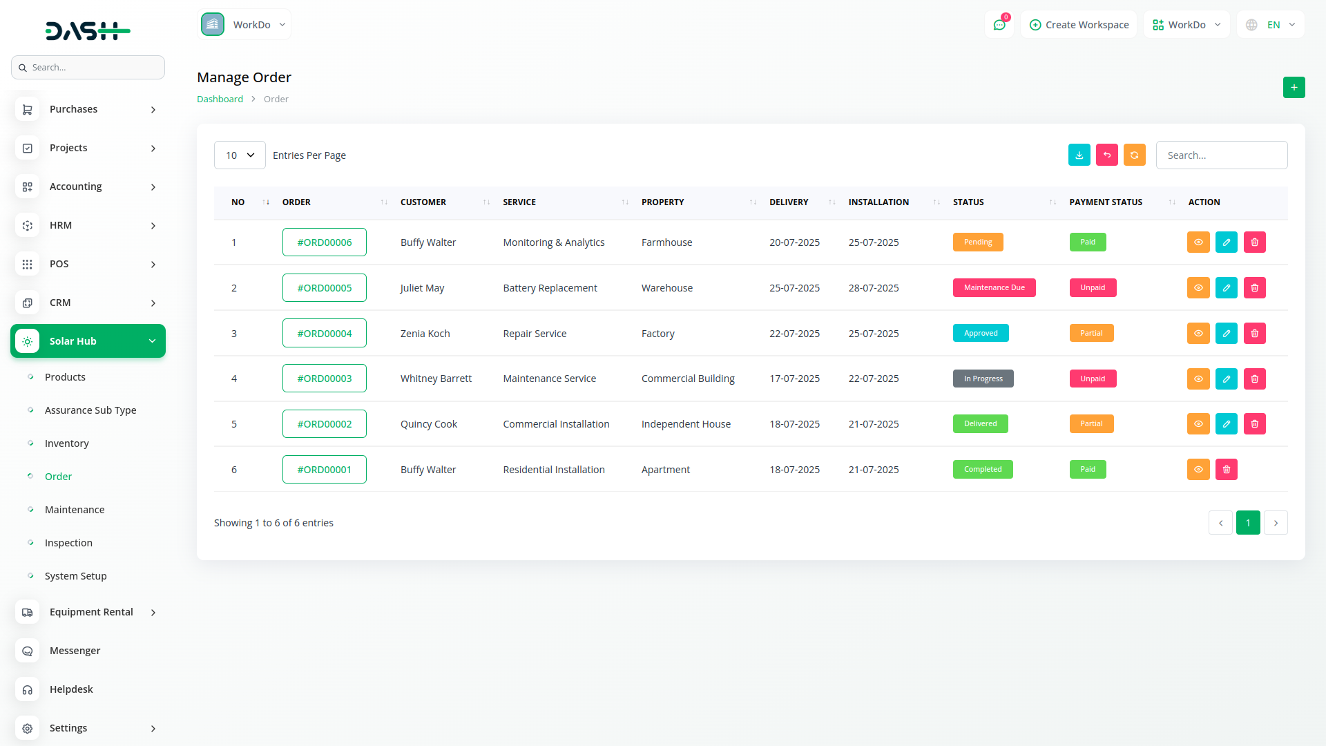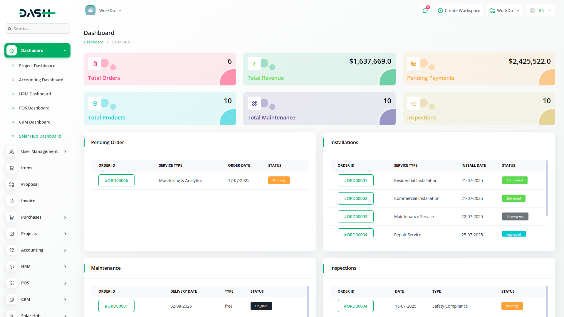 Monitor your entire solar business operation at a glance with a centralized and intuitive dashboard. The system displays real-time data across key areas such as orders, revenue, product inventory, maintenance, and inspections. Each widget gives you a quick snapshot of current metrics, allowing you to track performance, identify pending tasks, and make data-driven decisions quickly. The layout is clean, organized, and designed for both high-level overviews and detailed task tracking.