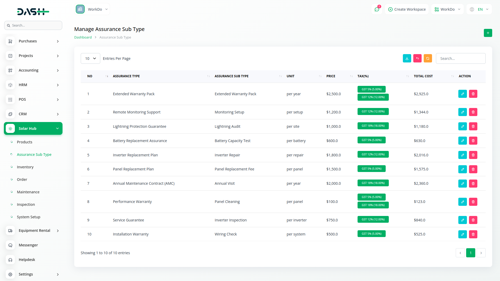 Set up and manage different types of assurance packages for your solar products and services. You can create custom assurance plans with your own units, pricing, and time periods. These assurance options can be added to specific products or full orders to give customers extra coverage. The system keeps track of each assurance type, its tax details, and how long it’s valid. You can also generate clear reports to see which assurances are used most and how they’re performing.